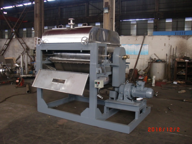 轉鼓式冷凝切片機是一種連續式傳導型冷卻干燥設備。物料在轉鼓外壁上獲得以水(蒸汽、導熱油)冷卻(傳熱)方式傳遞的溫差,進行冷卻(干燥)結片。在冷卻過程中,冷卻水(蒸汽、導熱油)由分配系統均勻的噴到轉鼓內壁,冷水(蒸汽、導熱油)的溫度由鼓內壁傳到鼓外壁,再穿過料膜,達到冷卻(干燥)結晶的目的。其結構簡單,效率高,可連續操作,故廣泛用于液態物料或帶狀物料。液態物料在轉鼓的一個轉動周期中完成布膜,刮料,得到制品的全過程。因此,在操作中,可通過調整進料濃度、料膜厚度、冷卻(加熱)介質溫度、滾桶轉數等參數獲得預期的產品和相應的產量。由于設備結構和操作上的特點,對膏狀和粘稠物料更適用。加料方式采用下浸料或布料方式:下浸料是將漿料送至筒體下方的浸料槽中,轉鼓筒體浸入料槽中,在回轉過程中物料自動粘于筒面,通過控制浸入深度和筒體轉速來調整料的厚度,設備結構簡單,主機動力低,亦可更具物料的料性設為上進料及后進料等方式,上布料是針對一些物料粘結度低而特殊設計的一種布料結構。完成對不同物料的冷凝結晶制片。冷凝(干燥)轉鼓結片機,整機設備完全封閉,雙面留有檢修門,密封條封閉,罩殼頂部配有空調多管進風口,提高冷卻效率增加產量。物料被置于料槽內,通過滾筒轉動帶動物料粘在轉鼓滾筒表面而形成薄膜,在滾筒轉動一圈的過程中冷卻(干燥)結晶成片狀粉體,再通過卸料刮刀片刮下,經螺旋輸送機物料完成對物料的收集。亦可直接由出料斗裝袋。